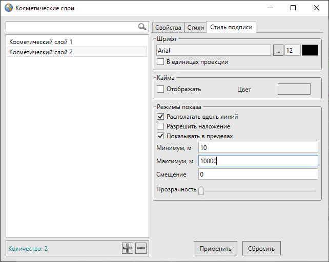 Для настройки стандартного стиля подписи к объектам слоя необходимо выбрать закладку «Стиль подписи» и настроить стиль отображения подписи к объектам косметического слоя (Рис. 2.235). Более подробно процесс настройки стиля подписи описан в разделе Добавление подписи к объектам слоя.