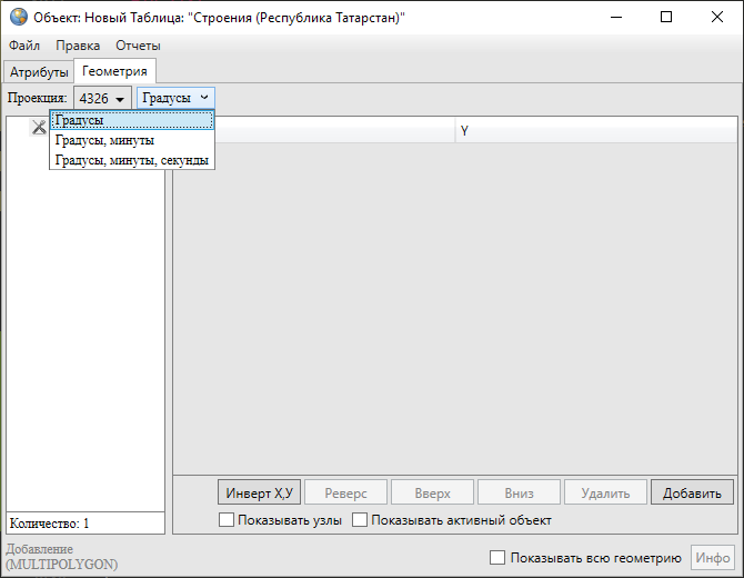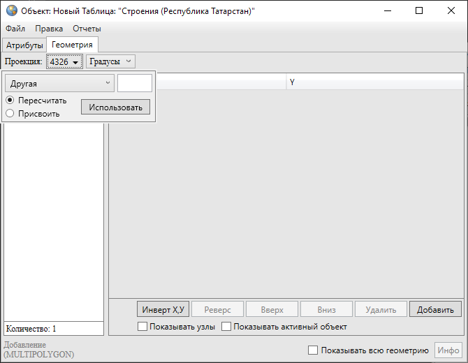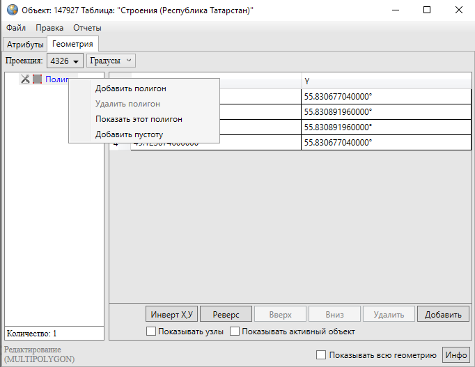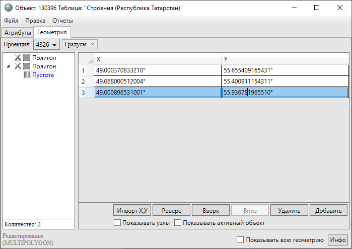 В нижней части окна расположены кнопки «Инверт X,Y», «Реверс», «Вверх», «Вниз», «Удалить», «Добавить», «Инфо», которые предназначены для редактирования геометрии объектов и получения геометрической информации о них. Кнопки «Инверт X,Y», «Реверс», «Инфо» становятся активными при выборе объекта из списка подобъектов мультиобъекта (по умолчанию выбран первый в списке объект). Кнопки «Вверх», «Вниз», «Удалить», «Добавить» становятся активными после выделения координат узла в таблице однократным нажатием левой кнопки мыши. Для объектов линейного и полигонального типов доступны все кнопки редактирования объектов, для объектов точечного типа доступны только кнопки «Инверт X,Y» и «Инфо». В нижней части окна также расположены поля «Показывать узлы», «Показывать активный объект», «Показывать всю геометрию», которые предназначены для предварительного просмотра результатов редактирования объектов на карте. Для линейных и полигональных объектов доступны все варианты просмотра результатов редактирования объектов, для объектов точечного типа недоступен вариант «Показывать узлы».
