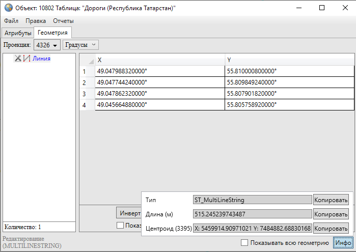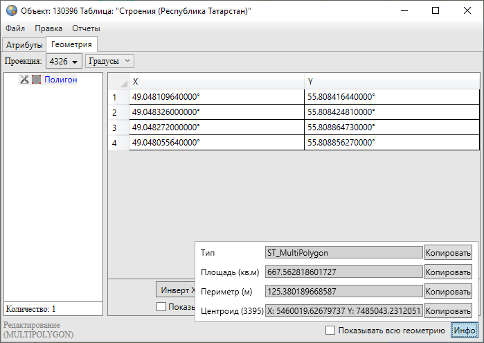 Кнопка «Инфо» предназначена для получения геометрической информации об объектах (в том числе, геометрической информации о подобъектах мультиобъектов). При нажатии кнопки «Инфо» отобразится информация с геометрическими характеристиками выбранного объекта (подобъекта). Для объектов точечного типа информация будет содержать тип объекта и координаты центроида объекта (справа от названия поля «Центроид» в скобках указан код проекции, в которой подсчитаны координаты центроида, Рис. 2.152); для объектов линейного типа — также длину объекта (Рис. 2.153); для объектов полигонального типа — также площадь и периметр объекта (Рис. 2.154). Кнопки «Копировать», расположенные справа от каждого поля, предназначены для копирования информации из соответствующего поля.