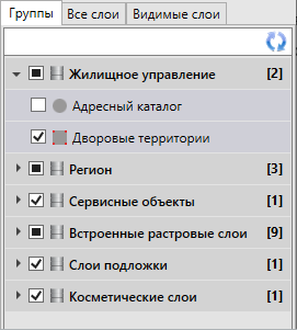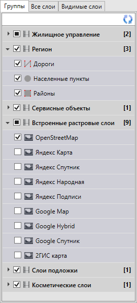 Панель управления слоями содержит список групп слоев, доступных для просмотра в соответствии с имеющимися правами доступа. Списки групп слоев могут быть различными у различных пользователей Программы.