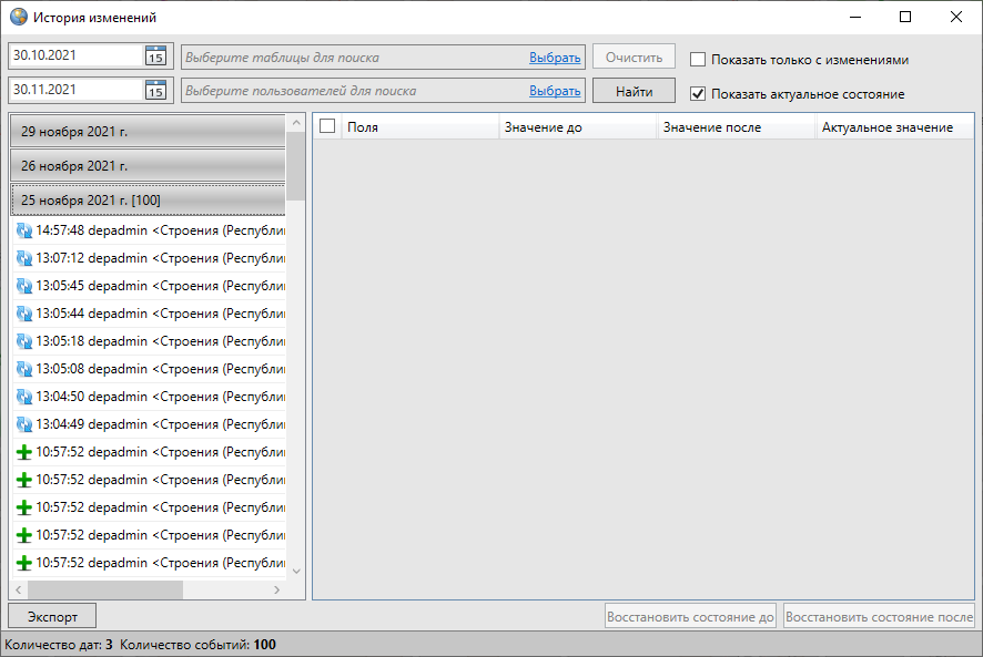 Окно «История изменений объектов» позволяет просматривать историю добавления, редактирования и удаления объектов тематических слоев, справочников, интервалов и других таблиц с данными, а также восстанавливать из истории изменений ранее внесенные данные по объектам. Возможности просмотра истории изменений и восстановления данных распространяются на таблицы данных, при создании или редактировании которых была подключена функция ведения истории изменений (подробнее в разделе Создание и редактирование таблиц).