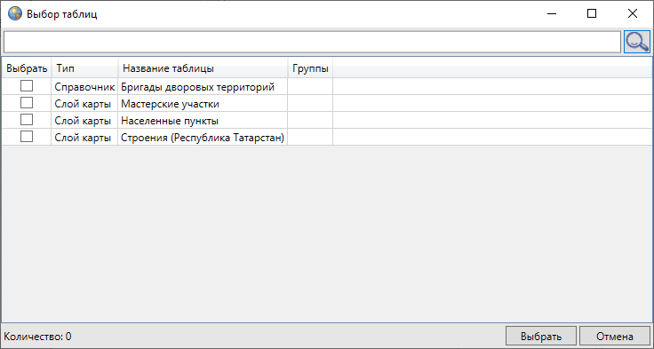 Для просмотра истории изменений объектов конкретной таблицы данных в поле «Выберите таблицы для поиска» из списка (Рис. 2.240) можно выбрать название таблиц (слоев, справочников, интервалов или других таблиц с данными). В списке будут содержаться названия только тех таблиц с данными, к которым была подключена функция ведения истории изменений (раздел Создание и редактирование таблиц).