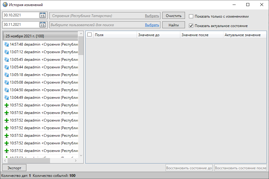 Для просмотра истории изменений за определенный временной промежуток необходимо выбрать период времени, указав в верхней части окна две даты: дату начала периода в поле «Дата начала» и дату завершения периода в поле «Дата окончания» (Рис. 2.242). Задать даты можно с использованием календаря, расположенного справа от поля, либо набрать даты вручную (в формате «ДД.ММ.ГГГГ»).