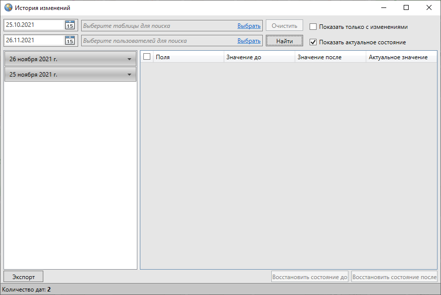 После заполнения полей необходимо нажать кнопку «Найти», которая находится в верхней части окна. В окне появится список дат изменения объектов таблицы (Рис. 2.244).