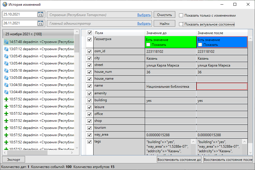 Для восстановления значения конкретного поля (атрибутивного или поля геометрии) достаточно выделить его в таблице галочкой и нажать кнопку «Восстановить состояние до» или «Восстановить состояние после» (Рис. 2.251). Выбор кнопки для восстановления данных состояния зависит от того, какое значение поля требуется восстановить. Можно выделить несколько полей для единовременного восстановления их значений. По умолчанию выделенными для восстановления являются все атрибутивные поля и поле геометрии.