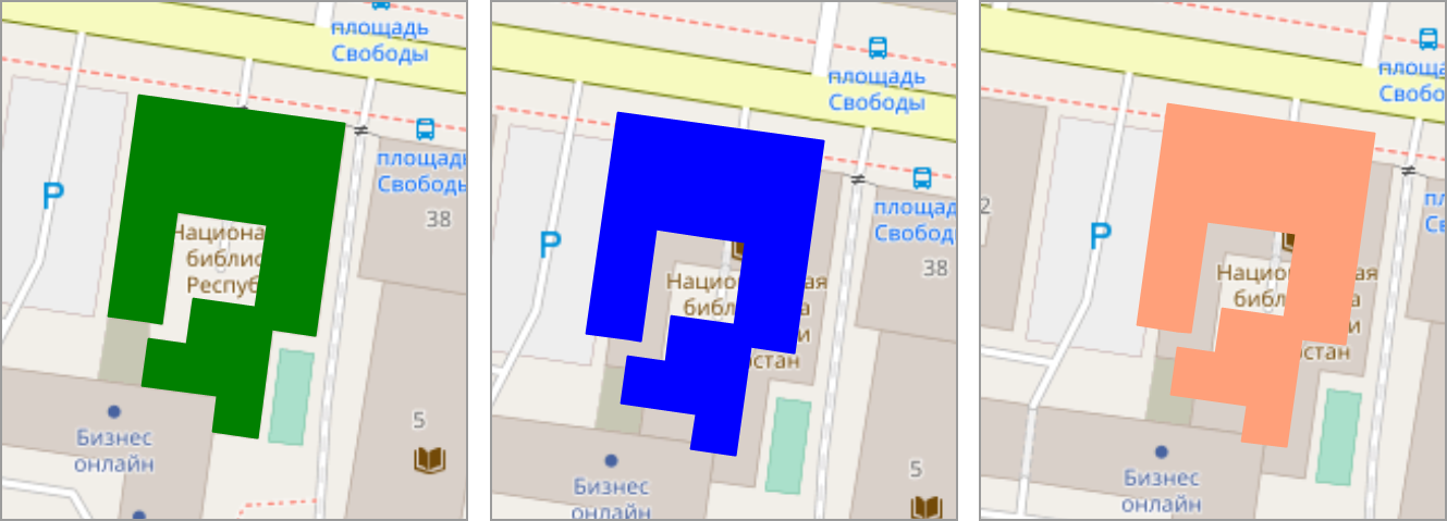 Галочка в поле «Показать» в столбцах «Значение до», «Значение после» и «Актуальное значение» позволит отобразить на карте геометрию объекта до изменений, после изменений и на данный момент времени, соответственно. Геометрия объекта до изменений будет отображена на карте зеленым цветом, геометрия объекта после изменений — синим цветом, актуальное состояние геометрии — коричневым цветом (Рис. 2.250).
