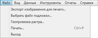 Раздел меню «Файл» содержит вкладки «Экспорт изображения для печати…», «Выбрать файл подложки…», «Геопривязка растра…», «Печать…», «Выход» (Рис. 2.27).