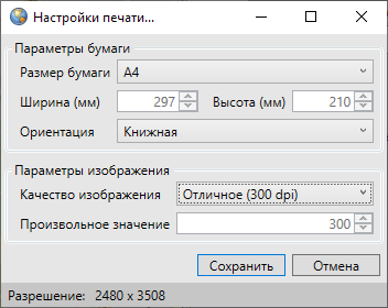 При выборе вкладки «Экспорт изображения для печати…» откроется окно «Настройки печати» (Рис. 2.28). В этом окне необходимо задать параметры изображения: размер бумаги, ориентацию и качество изображения. В нижней части окна отображается разрешение изображения, которое меняется в зависимости от выбранного качества. После задания всех параметров изображения и нажатия кнопки «Сохранить» откроется окно «Сохранение», в котором необходимо указать местоположение и имя сохраняемого файла. Изображение будет сохранено в формате *.bmp и готово к печати.