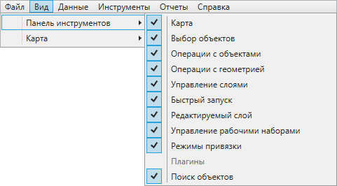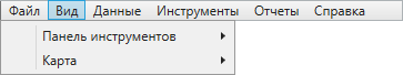 Раздел меню «Вид» содержит вкладки «Панель инструментов» и «Карта» (Рис. 2.29). Вкладка «Панель инструментов» предназначена для управления отображением панелей инструментов, вкладка «Карта» — для пользовательских настроек карты.