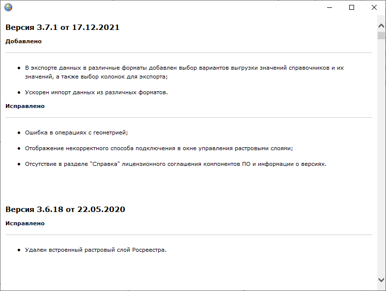 При переходе по ссылке «Информация о версиях» в окне «О программе MapEditor GS» откроется окно «Версии» (Рис. 2.38), в котором представлена подробная информация о доработках и исправлениях, производимых в каждой новой версии Программы.