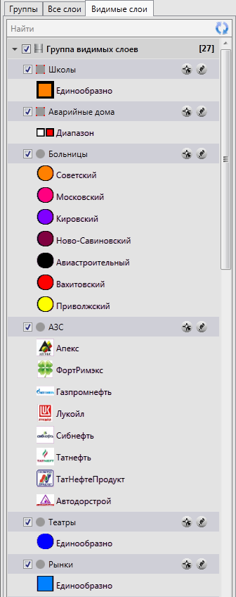 Для тематических слоев карты, имеющих одинаковый стиль отображения для всех объектов, будет представлен один значок стиля отображения объектов и надпись «Единообразно». Для тематических слоев карты, имеющих настройку стилей отображения объектов по справочнику или интервалу, будут представлены значки всех стилей, которые были использованы для окраски объектов слоя (Рис. 2.44, слои «Больницы», «АЗС»). Для тематических слоев карты, имеющих настройку стилей отображения объектов по диапазону, будут представлены значки двух цветов, соответствующих минимальному и максимальному значениям атрибутивного поля, к которому подключен диапазон (Рис. 2.44, слой «Аварийные дома»).