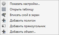 «Показать настройки…» — открытие окна «Редактирование свойств таблицы» для просмотра и редактирования свойств слоя. Наличие раздела зависит от прав пользователя.