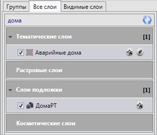 При включении видимости тематического или косметического слоя в правой части панели слоя отобразятся дополнительные кнопки (Рис. 2.54):