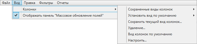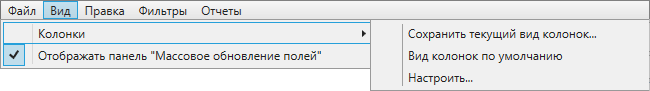 Раздел меню «Вид» предназначен для настройки вида таблицы в окне «Таблица». Раздел содержит вкладки «Отображать панель «Массовое обновление полей» и «Колонки» с подвкладками «Сохранить текущий вид колонок…», «Вид колонок по умолчанию», «Настроить…» (Рис. 2.189), подробнее в разделе Настройка вида таблицы данных.