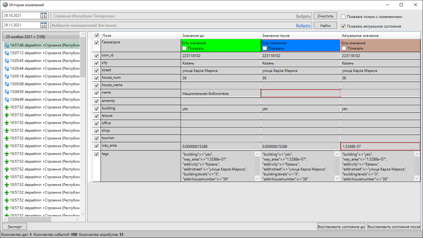 Выбор вкладки «История…» позволит просмотреть историю добавления, редактирования и удаления объектов рассматриваемой таблицы с данными, а также восстановить из истории ранее внесенные атрибутивные данные (Рис. 2.197). Работа с данным окном подробно описана в разделе История изменений объектов.