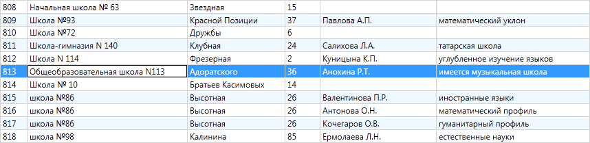 Столбцы информационной таблицы соответствуют атрибутивным полям выбранной таблицы с данными. В нижней части информационного окна «Таблица» (Рис. 2.185) отображается общее количество строк (общее количество объектов таблицы данных), количество загруженных строк (количество загруженных объектов таблицы данных), количество выбранных строк (объектов) таблицы и количество колонок таблицы (количество атрибутивных полей таблицы данных). Выделить объекты таблицы данных можно однократными нажатиями левой кнопки мыши при удерживаемой на клавиатуре клавише «Shift» (Рис. 2.185). Также можно встать на любую строку таблицы и использовать сочетание клавиш «Ctrl»+«A» для выделения всех записей таблицы.