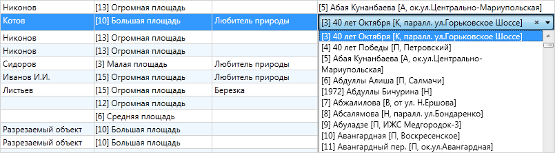 Для столбцов, связанных со справочниками, при выборе варианта вхождения «=» в поле поиска отобразится выпадающий список значений, содержащий элементы справочника (Рис. 2.222).