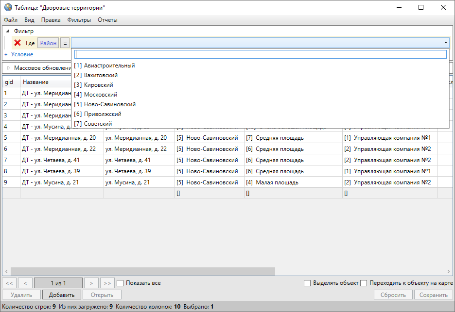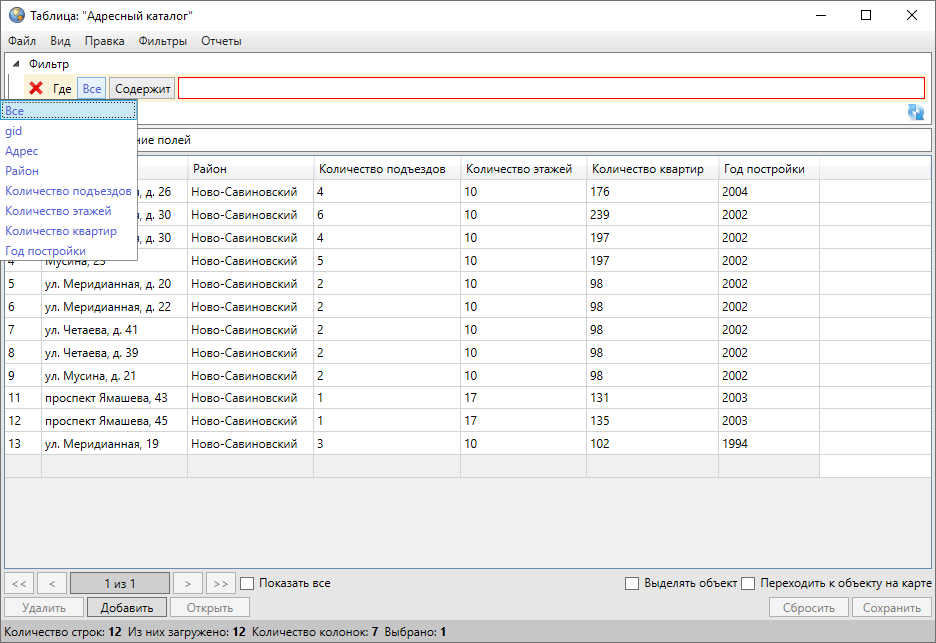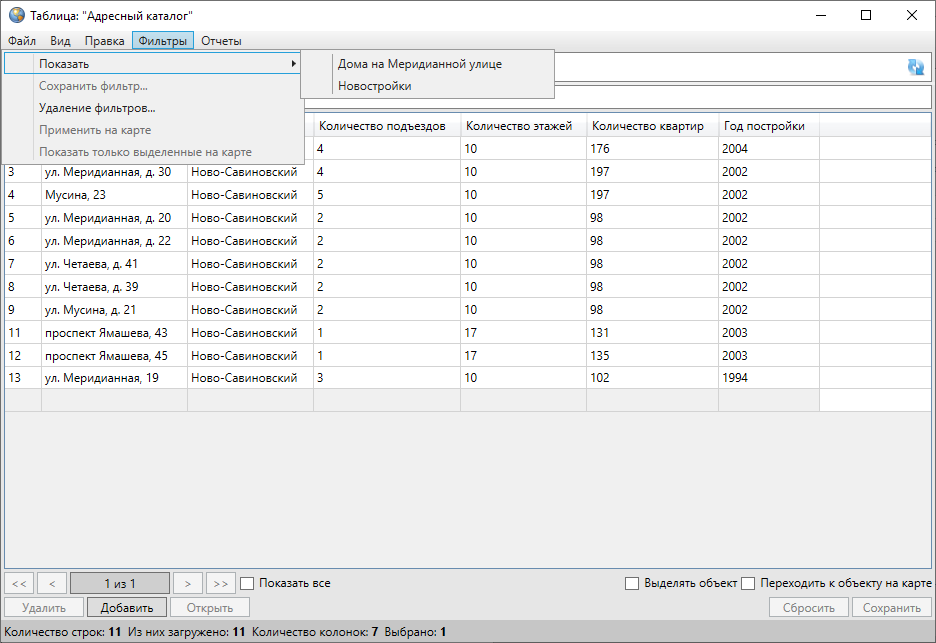 Раздел меню «Фильтры» предназначен для фильтрации информации в таблице данных. Раздел содержит вкладки «Показать», «Сохранить фильтр…», «Удаление фильтров…», «Применить на карте», «Показать только выделенные на карте» (Рис. 2.191, раздел Применение фильтров).