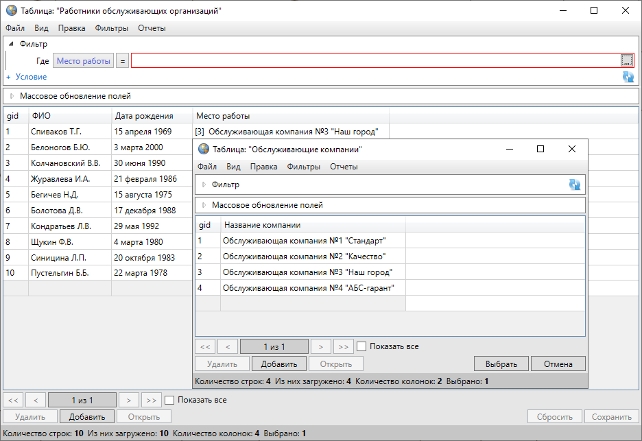 Для столбцов, связанных с таблицами данных (связи между таблицами типа «один ко многим»), при выборе варианта вхождения «=» в поле поиска отобразится кнопка обзора («…») для перехода к связанной таблице и выбора значений (Рис. 2.223).