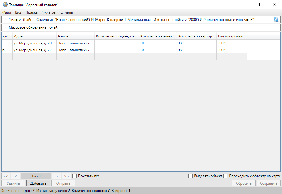 Если таблица с данными является слоем карты, то галочка в поле «Выделять объект» и выбор объекта в таблице (однократным нажатием левой кнопки мыши) обеспечит выделение объекта на карте контрастным цветом. Галочка в поле «Переходить к объекту на карте» и выбор объекта в таблице обеспечит переход к объекту на карте и его выделение контрастным цветом. При включении функций «Выделять объект» или «Переходить к объекту на карте» слой автоматически становится видимым. По умолчанию функции выделения объекта и перехода к объекту на карте выключены.