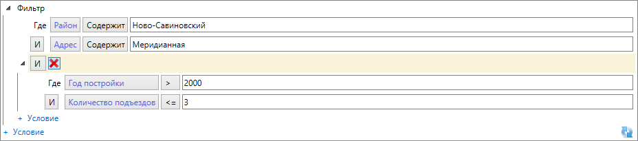 Для добавления нового фильтра следует перейти по ссылке «+ Условие» («Добавить условие»), выбрать логический оператор для связи нового фильтра с предыдущим («И», «ИЛИ») и задать параметры для нового фильтра: ввести символы для поиска, выбрать атрибутивное поле и вариант вхождения символов (Рис. 2.225).