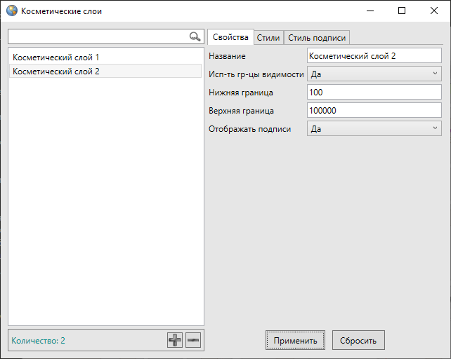 Косметические слои могут быть полезны пользователям для хранения объектов разного типа геометрии, настройки индивидуального стиля отображения объектов одного слоя, импорта и экспорта геометрии объектов, печати карты.