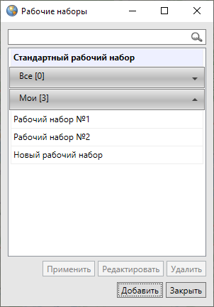 В списке представлены: стандартный рабочий набор, группа рабочих наборов «Все» (наборы, созданные другими пользователями и доступные для данного пользователя) и группа рабочих наборов «Мои» (наборы, созданные пользователем).