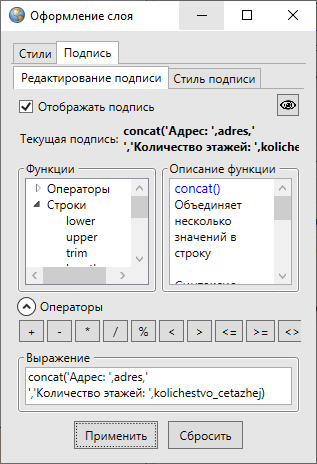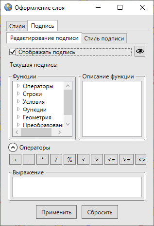 В поле «Выражение» будет отображаться подпись, сформированная из текстовых записей, значений атрибутивных полей, арифметических выражений. В поле «Функции» расположены возможные составляющие подписи: