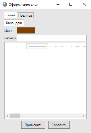 Вкладка «Карандаш» (Рис. 2.65) используется для настройки отображения линейных объектов (можно выбрать тип, цвет и размер линии).