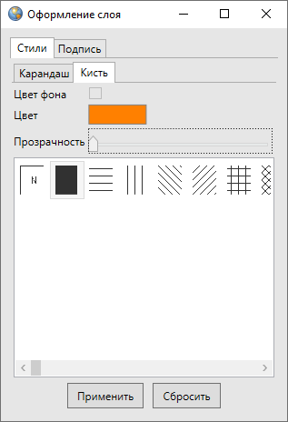 Вкладки «Карандаш» и «Кисть» (Рис. 2.66) используются для настройки отображения полигональных объектов (можно выбрать тип и цвет каймы объектов, тип и цвет окраски объектов, цвет фона и цвет штриховки). Снятие галочки в поле «Цвет фона» позволит сделать фон прозрачным.