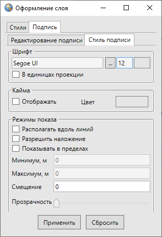 Параметр «Режимы показа» также позволит настроить видимость подписи объектов слоя в заданных масштабах. Для этого необходимо поставить галочку в поле «Показывать в пределах» и в полях «Максимум» и «Минимум» ввести верхнюю и нижнюю границы видимости подписи соответственно. Например, если указать в поле «Минимум» значение, равное 1000, и в поле «Максимум» значение, равное 20000, то подписи к объектам слоя будут видны в масштабах карты от 1:1000 до 1:20000. При отсутствии галочки в поле «Показывать в пределах» подпись будет отображаться на карте в масштабах видимости самого объекта на карте.