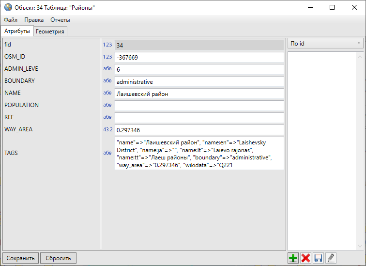 При выборе объекта однократным нажатием левой кнопки мыши в правой части окна отобразится атрибутивная информация по объекту. Информация предназначена для просмотра, она не доступна для редактирования (Рис. 2.97). При нажатии кнопки «Атрибутика» для объектов тематического или косметического слоя откроется окно «Объект» (Рис. 2.98). В окне «Объект» можно отредактировать атрибутивные и геометрические данные по объекту (редактирование атрибутивных данных объектов подробно описано в разделе Работа с атрибутивными данными объектов, редактирование геометрических данных — в разделе Редактирование геометрии объекта слоя).