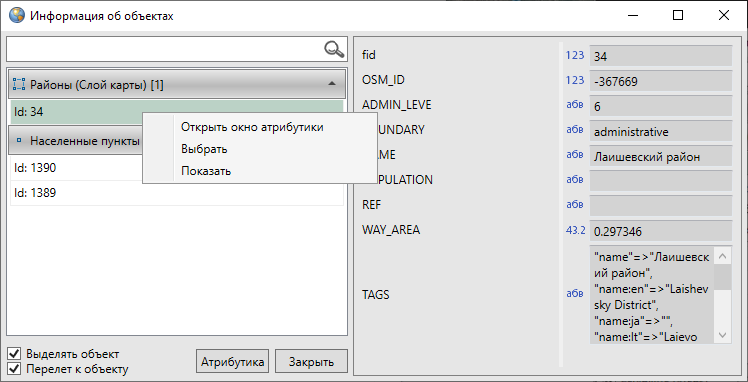 информации (списка слоев, объектов и их атрибутивных данных) в выбранной