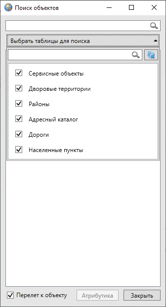 При нажатии на панель «Выбрать таблицы для поиска» откроется выпадающий список доступных для поиска таблиц данных. Путем проставления/снятия галочек в поле слева от наименования таблицы можно выбрать таблицы для поиска объектов (Рис. 2.57). По умолчанию поиск ведется по всем доступным для поиска таблицам данных.