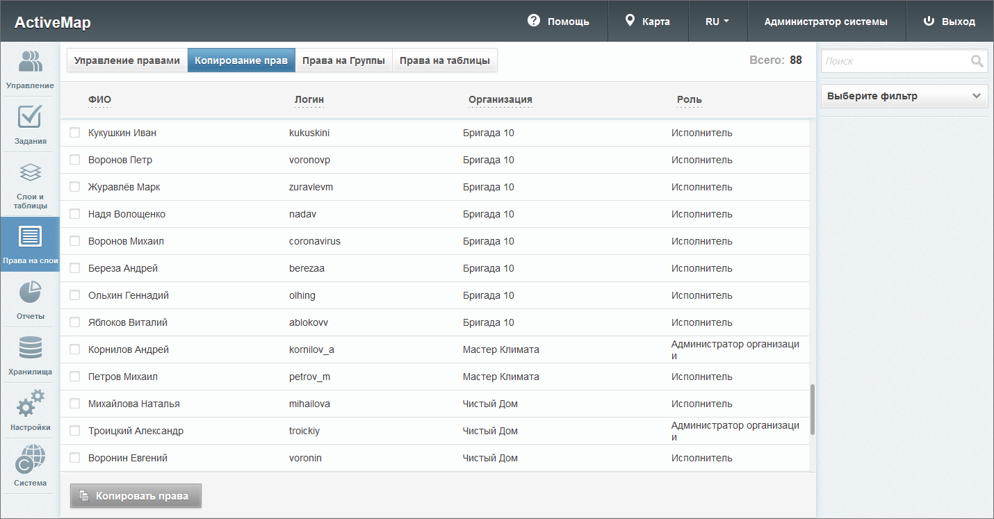 Для этого следует из списка выбрать пользователя, для которого необходимо скопировать права, и нажать кнопку