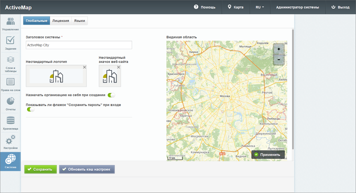 В данной вкладке можно изменить заголовок системы, добавить свой логотип и значок web-сайта, включить автоматическое назначение организации при создании и сохранение пароля при входе.