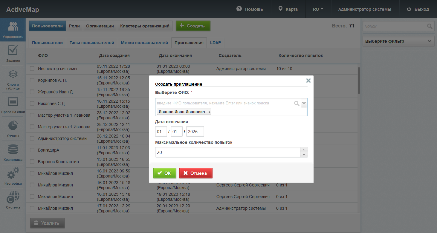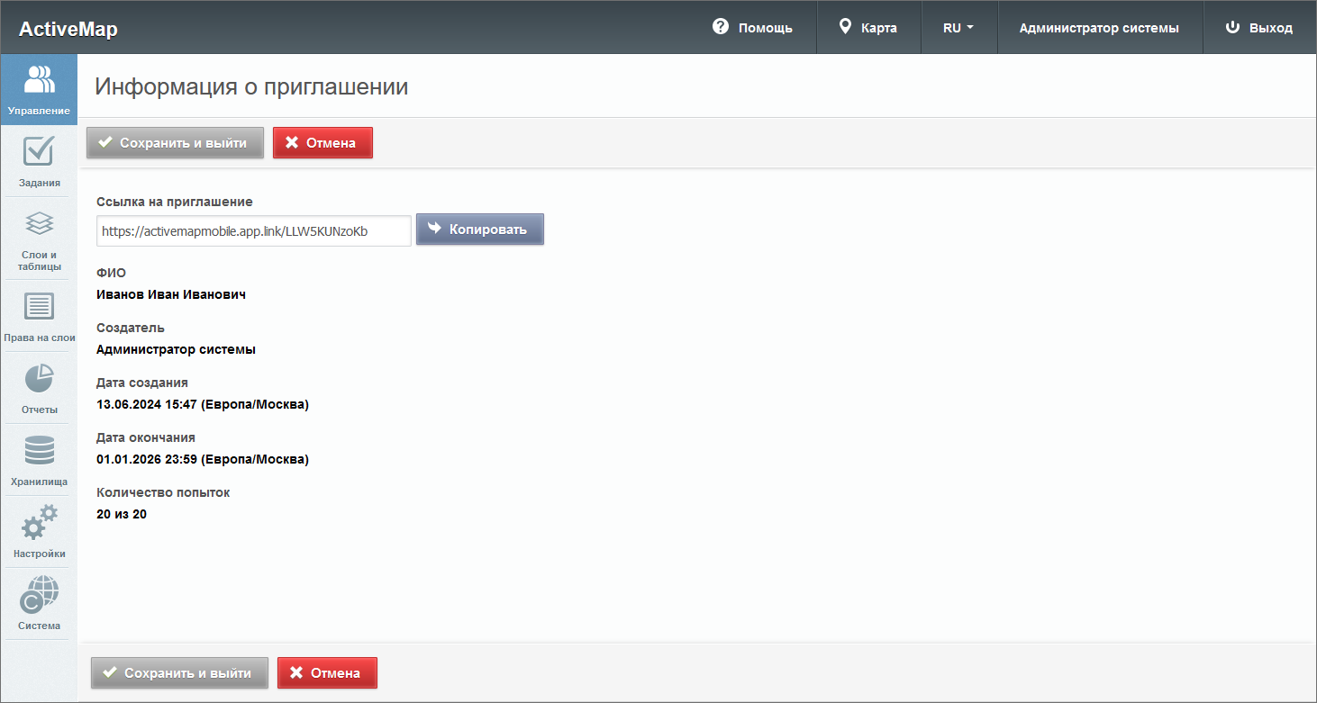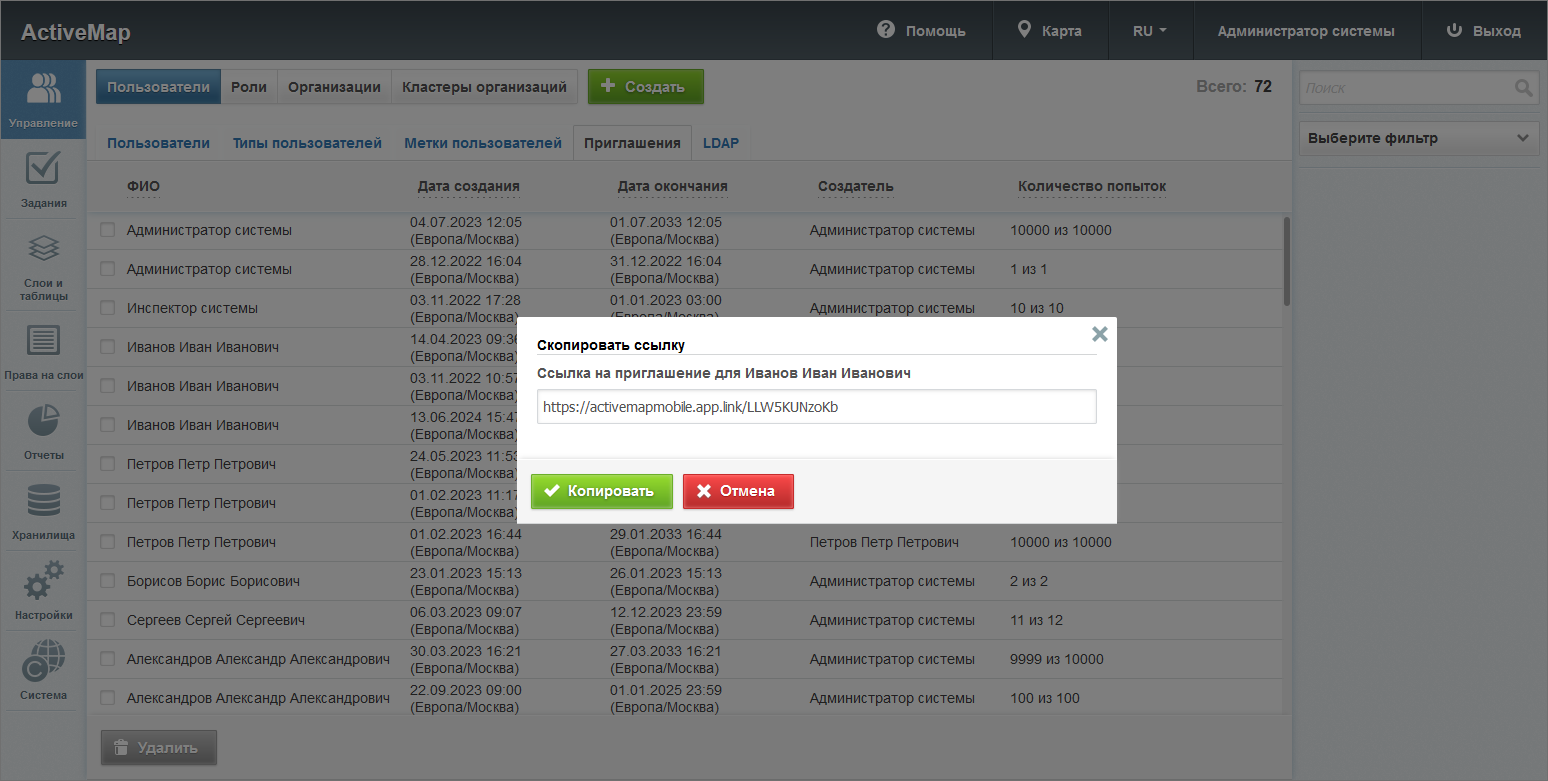 – позволяет сгенерировать новое приглашение для данного пользователя.последняя активная ссылка-приглашение в систему с кнопкой копирования.