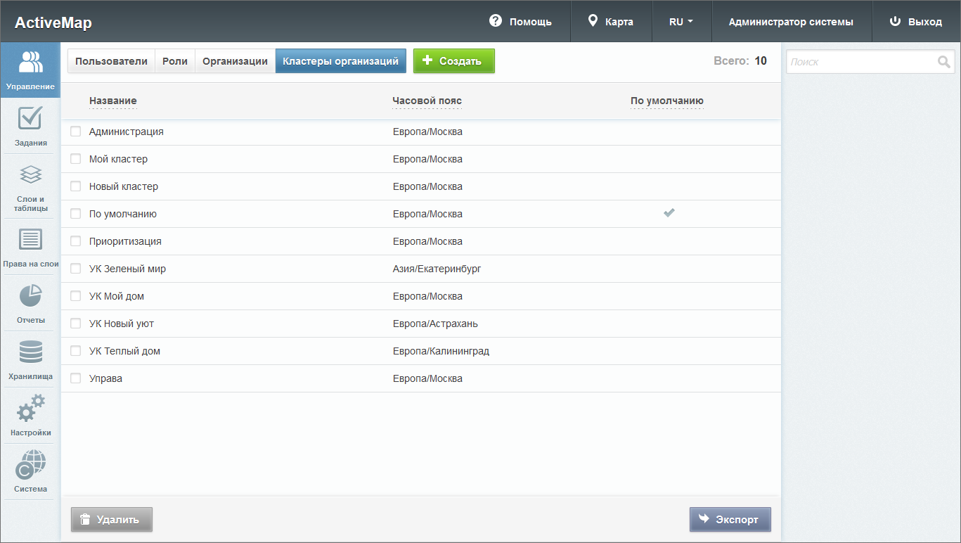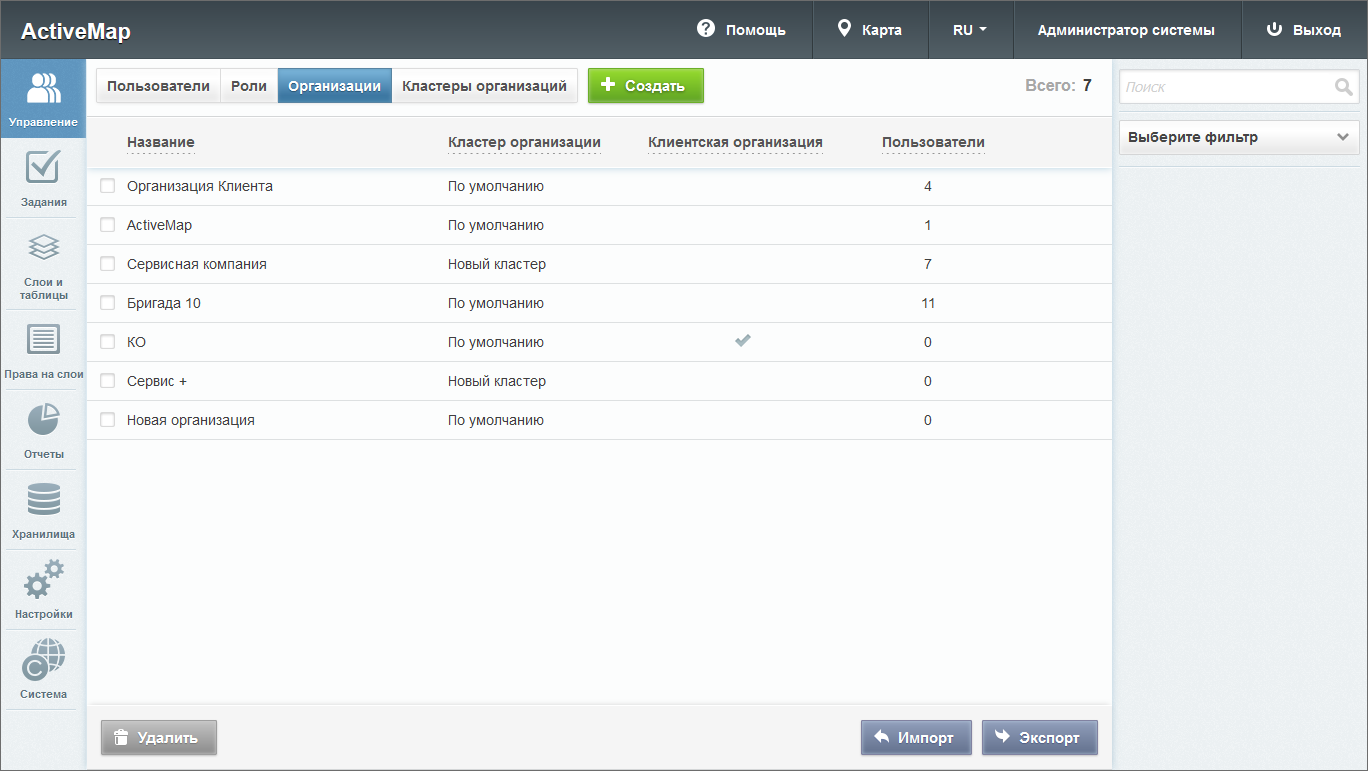 «Администратор системы» отвечает за настройку Системы, в том числе управление кластерами, организациями, пользователями всех ролей, контрактами, справочниками, а также за распределение прав доступа к слоям и отчетам.