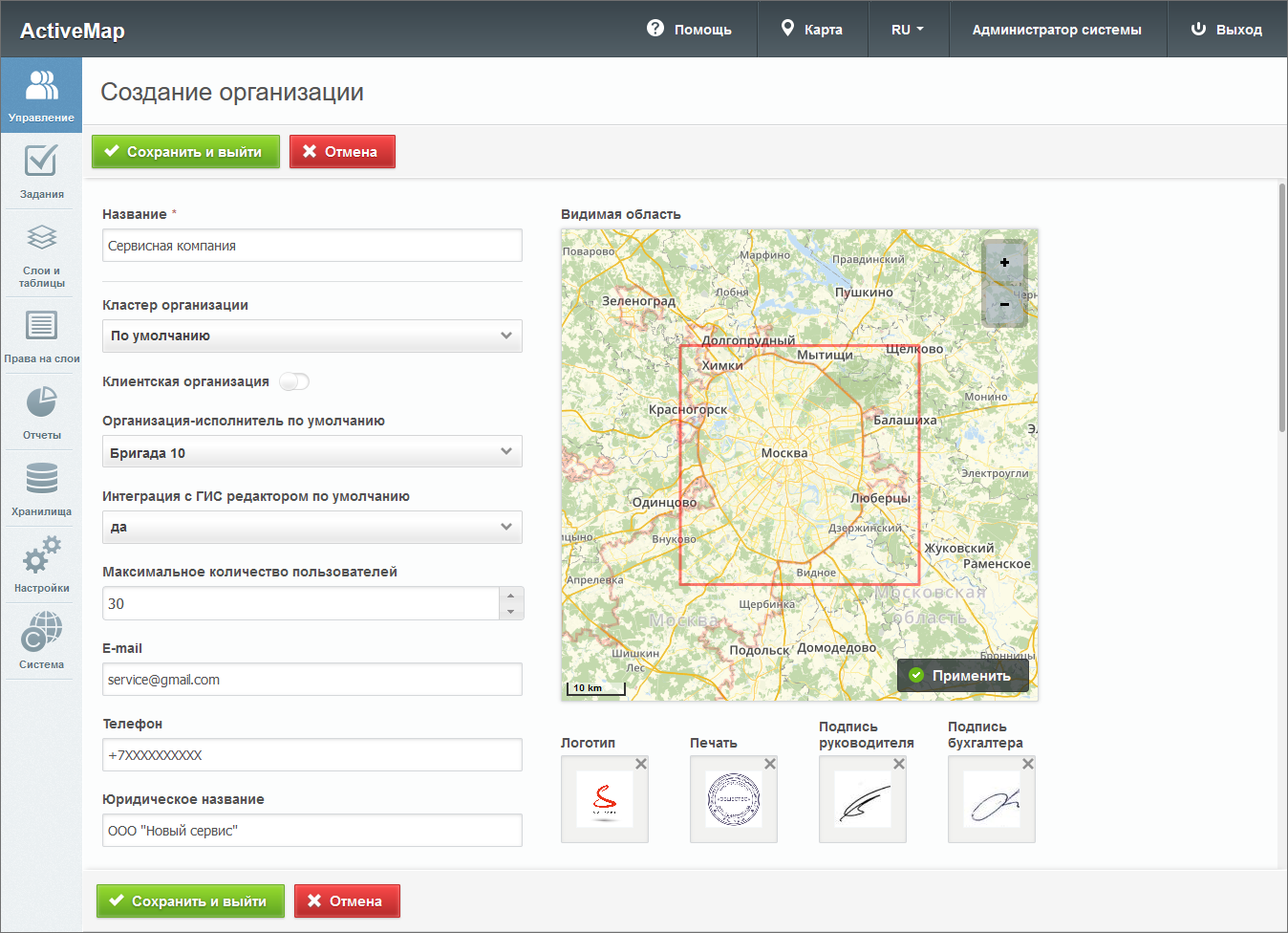 . Если оставить остальные поля пустыми, они будут автоматически заполнены значениями по умолчанию (за исключением e-mail, номера телефона, юридического названия и других данных организации). Автоматически присвоенное хранилище, отмеченное в системе по умолчанию, можно поменять вручную в базе данных. Видимая область и кластер будут соответствовать основной организации администратора кластера или же значению по умолчанию, если организацию создает администратор системы. Данной организации автоматически будут предоставлены права на те виды работ (глобальные и/или локальные), для которых активирована опция «Для всех организаций».