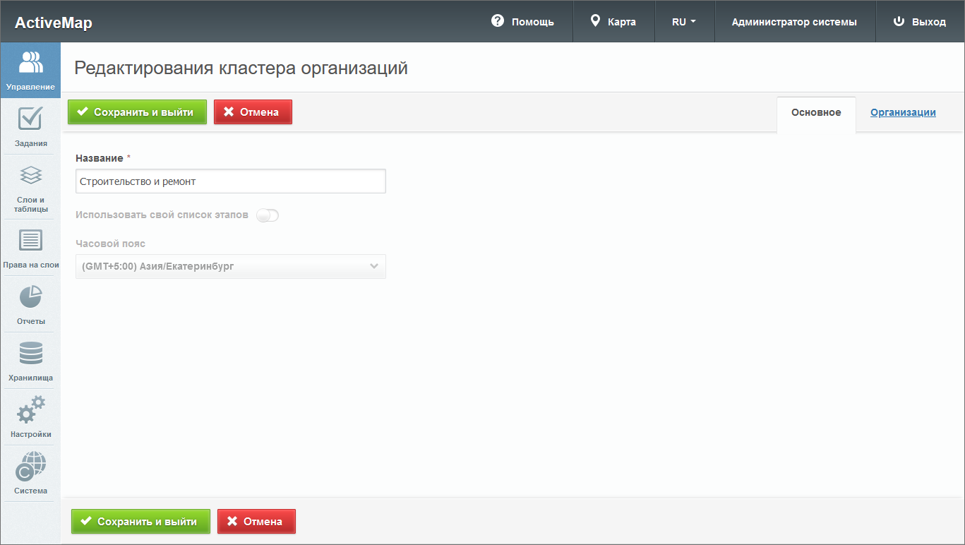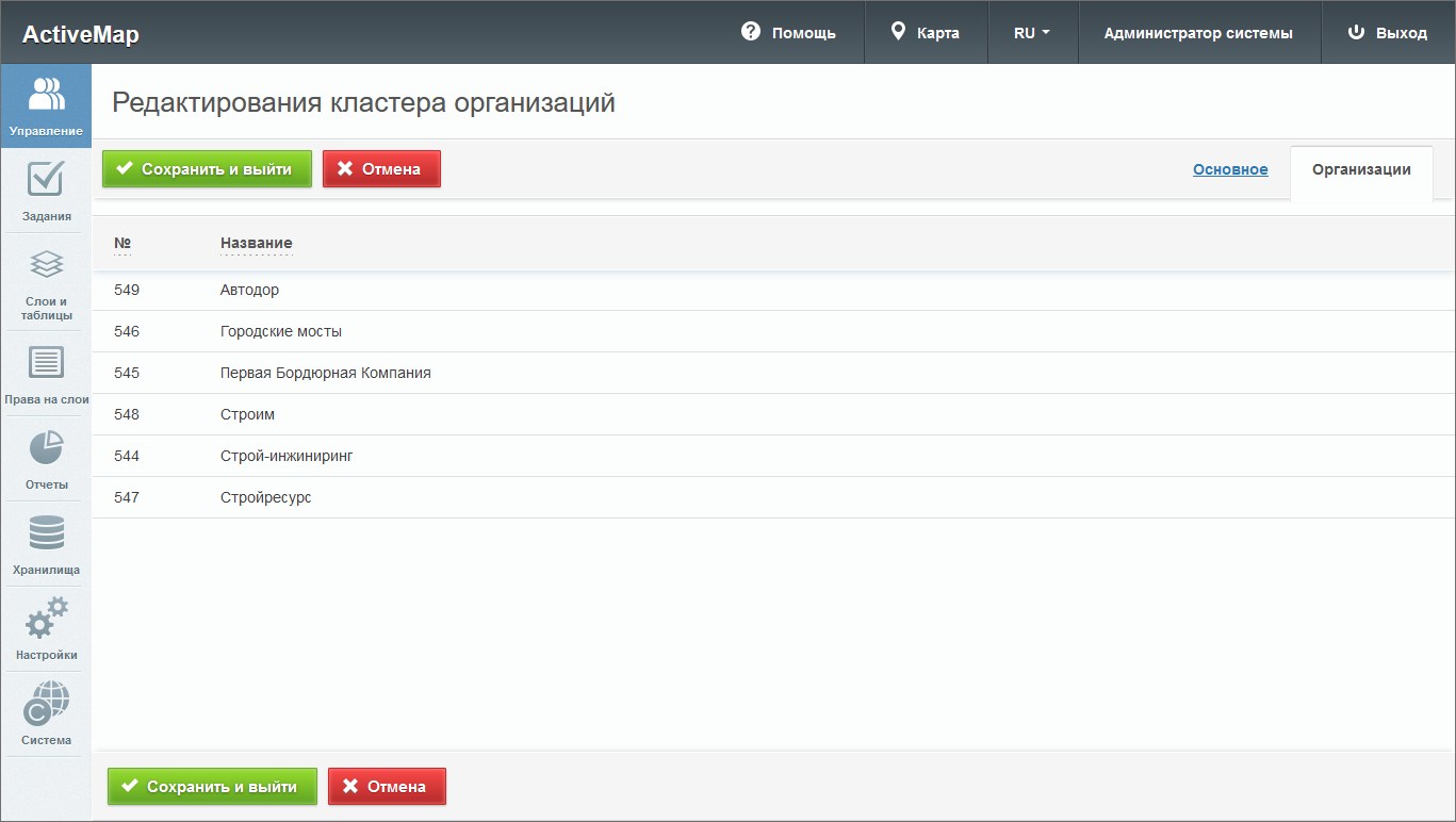 Во вкладке «Кластеры организаций» администратору доступно редактирование информации об организациях системы. При нажатии на