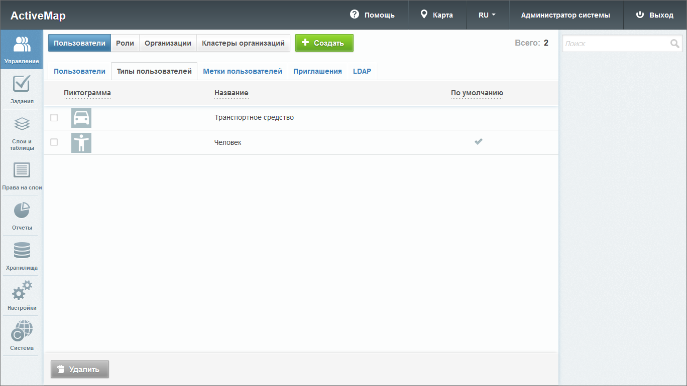 В системе автоматически доступны два типа пользователей: «Транспортное средство» и «Человек». «Человек» всегда является типом по умолчанию, его нельзя удалить, а также нельзя сделать типом по умолчанию какой-либо другой тип пользователя.