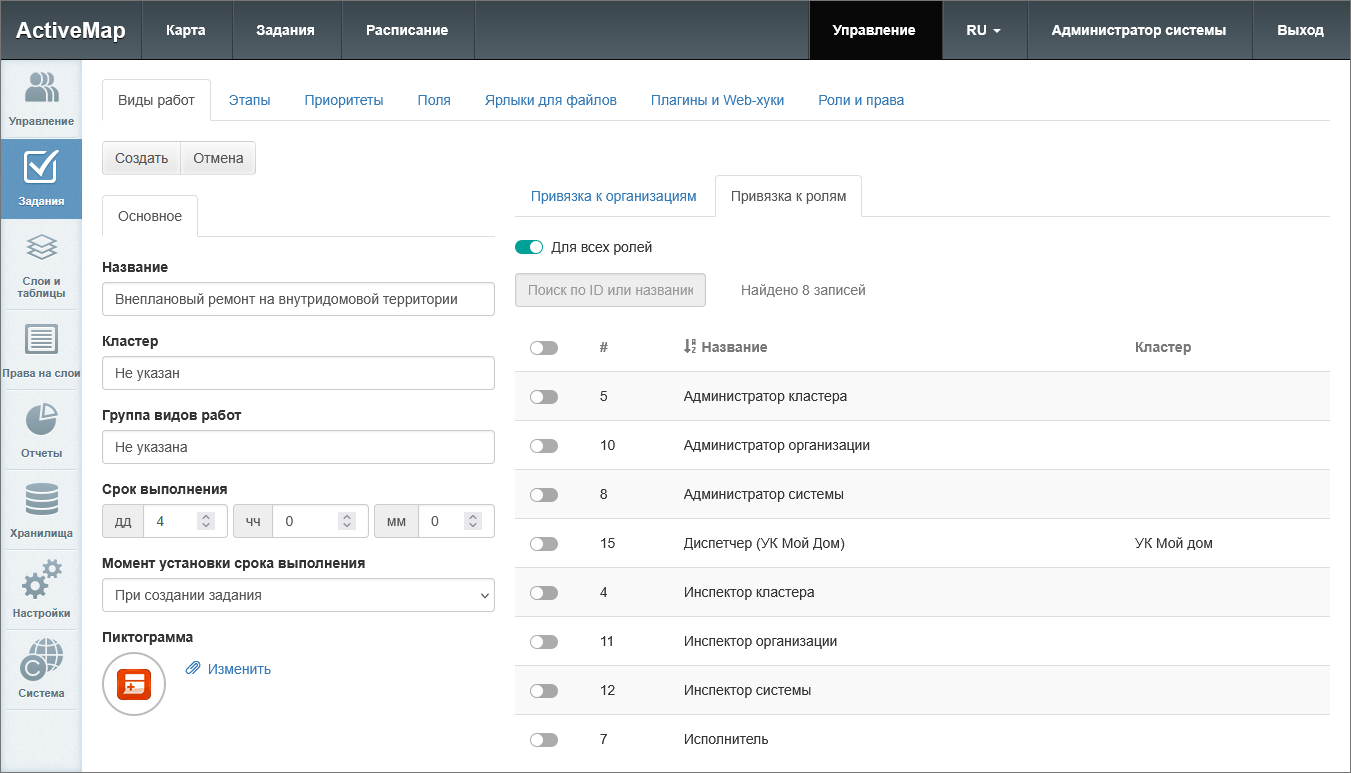 тумблер «Для всех ролей» – делает вид работ доступным для всех ролей в системе (для глобальных видов работ) или внутри кластера (для локальных видов работ);