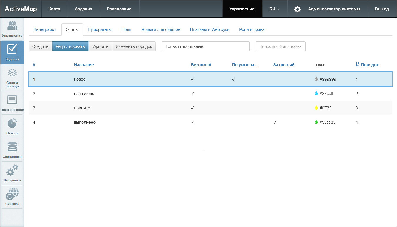 Выделяют группу локальных (с привязкой к кластеру) и глобальных (без привязки) этапов работ. Этапы можно сортировать в рамках группы. Администратор системы может сортировать любые группы, администратор кластера – только локальные этапы в своем кластере.