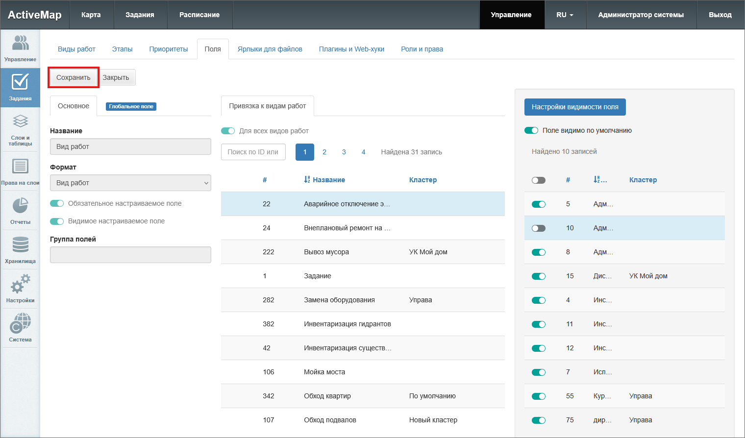 тумблер «Для всех видов работ» – делает поле доступным для всех видов работ в системе (глобальные настраиваемые поля) или внутри кластера (локальные настраиваемые поля);