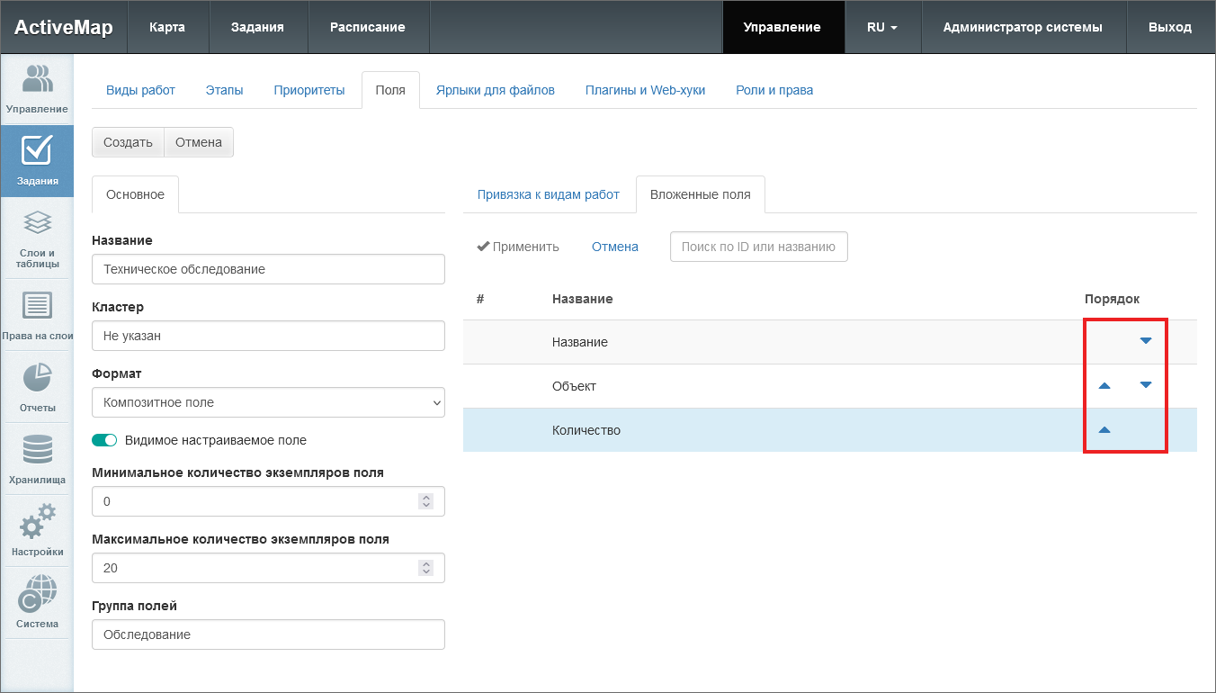 Вложенные поля нельзя отнести к какой-либо группе или привязать к конкретному виду работ. Вложенные поля не могут существовать в системе без привязки к композитному полю. Вложенные поля можно сортировать, задавая порядок их отображения в карточке задания (Рис. 2.96).