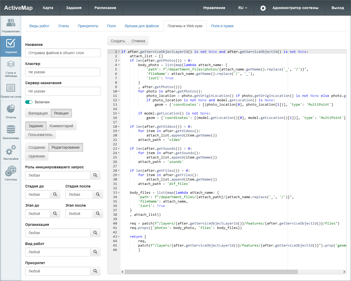 В поле справа нужно написать скрипт на языке Python. Роли, стадии и этапы до/после, организации, виды работ и приоритеты можно прописать непосредственно в скрипте в более сложных сочетаниях, чем позволяет обычное включение тумблеров в левой части окна. Если данные поля упоминаются в скрипте, в левой части можно оставить для них значения по умолчанию – «любая/любой».