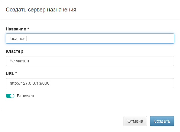 Для добавления нового сервера нужно перейти в соответствующий подраздел и нажать «Создать». В открывшемся окне заполнить поля «Название», «Кластер» (при необходимости) и «URL», переключить тумблер «Включен» в нужное положение (Рис. 2.102).