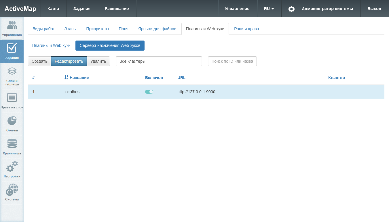 Созданный сервер отобразится в общем списке серверов назначения Web-хуков (Рис. 2.103). При необходимости данные серверов в списке можно отредактировать или удалить (за исключением кластера). Кластер можно задать при создании сервера назначения, но нельзя изменить или удалить.