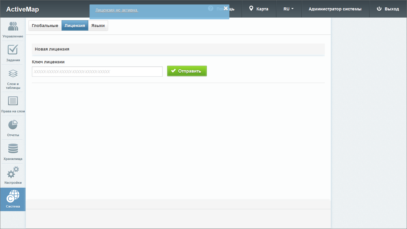 Для активации лицензии администратору необходимо перейти в блок “Система” и выбрать вкладку “Лицензия”, либо перейти по ссылке во всплывающем окне «Лицензия не активна». Во вкладке “Лицензия” ввести заранее полученный у поставщика услуг ключ лицензии и нажать