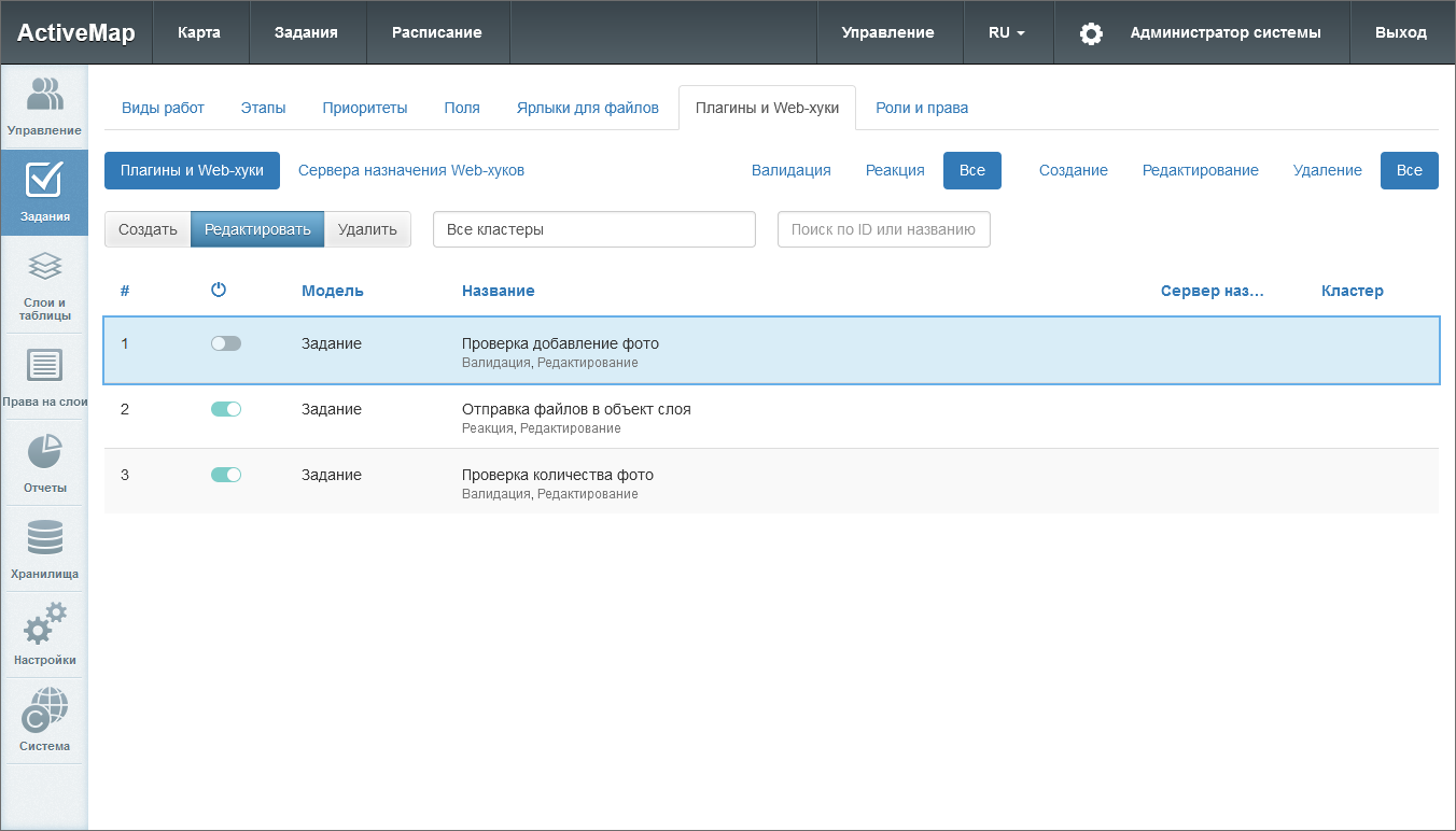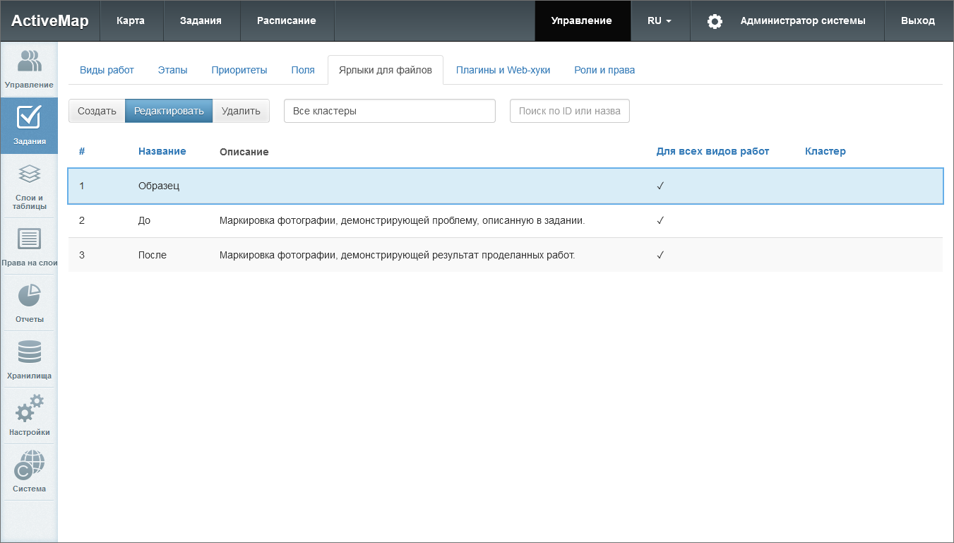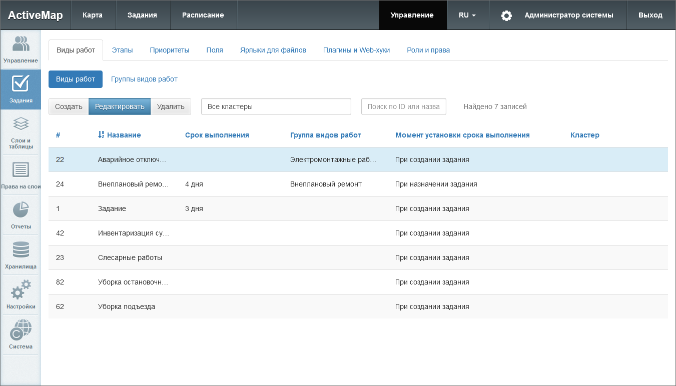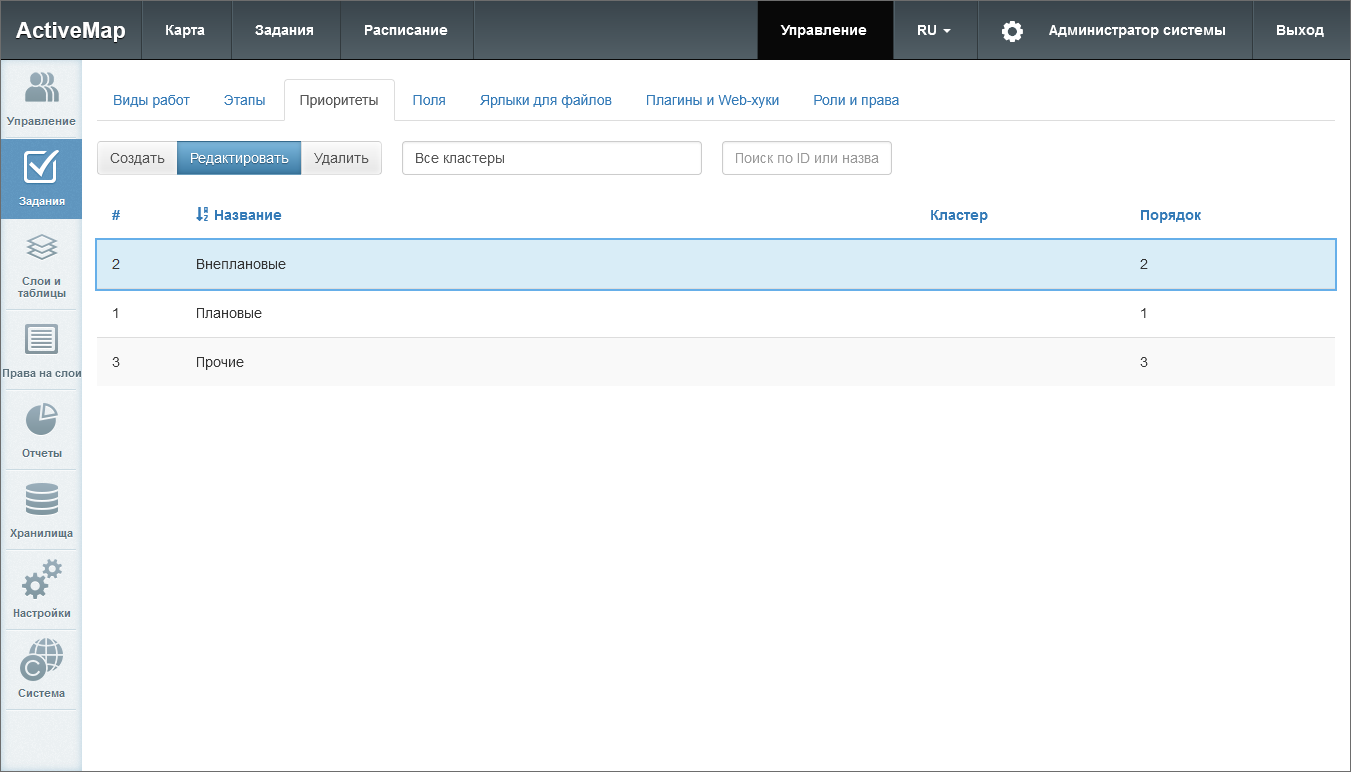 Виды работ, их группы, этапы, приоритеты и плагины могут быть локальными (с привязкой к определенному кластеру) и глобальными (без привязки). Глобальные сущности может администрировать только администратор системы, локальные – администратор системы и администратор кластера. Локальные сущности не видны пользователям вне указанного кластера.
